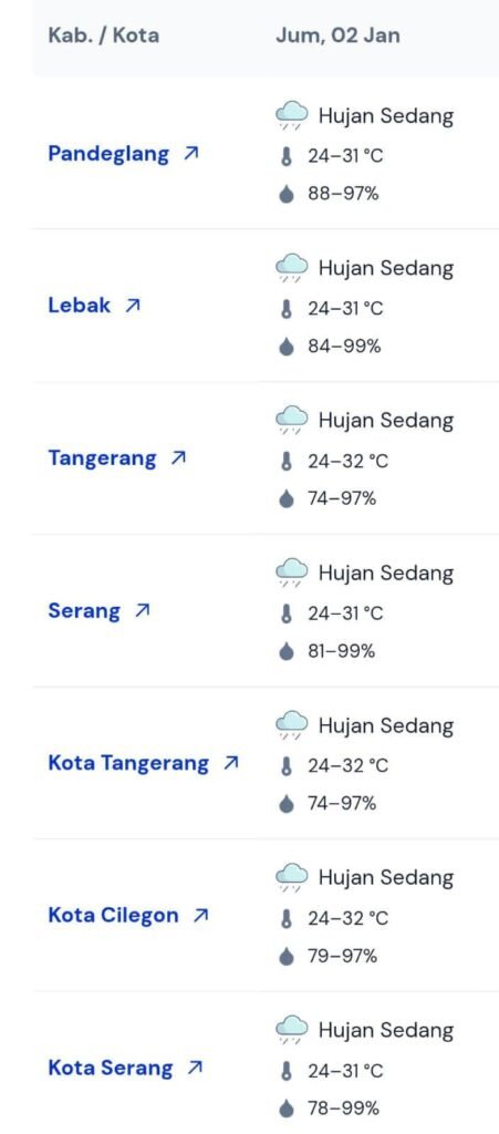 “Pada siang hari, cuaca diprakirakan hujan ringan hingga hujan sedang. Sementara pada malam hari, potensi hujan ringan hingga sedang terjadi di wilayah Ciputat, Serpong, Pondok Aren, Pamulang, Setu, Cisauk, Pagedangan, Legok, Curug, Panongan, Jambe, Cikupa, Tigaraksa, Sumur, Cimanggu, Cibaliung, Cikeusik, Cigeulis, Panimbang, Angsana, Munjul, Cibitung, Sindangresmi, Malingping, Panggarangan, Bayah, Cipanas, Muncang, Leuwidamar, Bojongmanik, Gunungkencana, Cirinten, Banjarsari, Sajira, Cibeber, Cilograng, Wanasalam, Sobang, Lebakgedong, dan Cigemlong,” jelasnya.