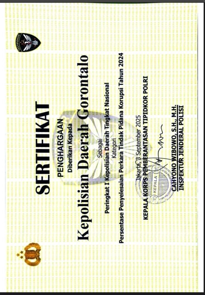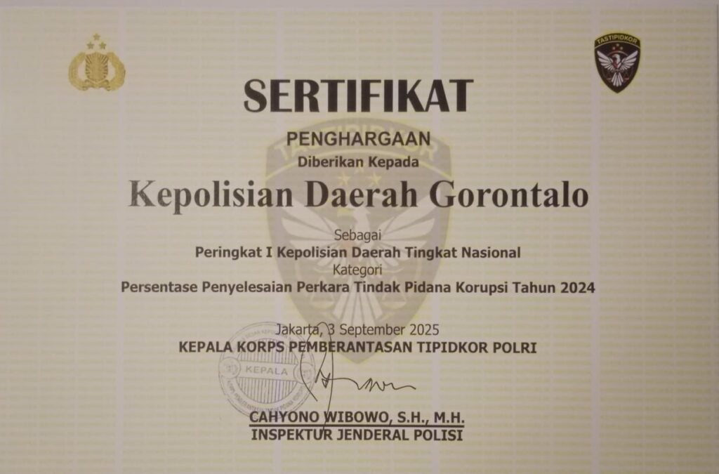Dalam sertifikat penghargaan tersebut, Polda Gorontalo dinilai menunjukkan komitmen tinggi, konsistensi, dan kinerja optimal dalam menuntaskan berbagai kasus korupsi sepanjang periode penilaian. Capaian ini menjadi bukti nyata kesungguhan jajaran kepolisian Gorontalo dalam mewujudkan penegakan hukum yang transparan, profesional, dan berintegritas.