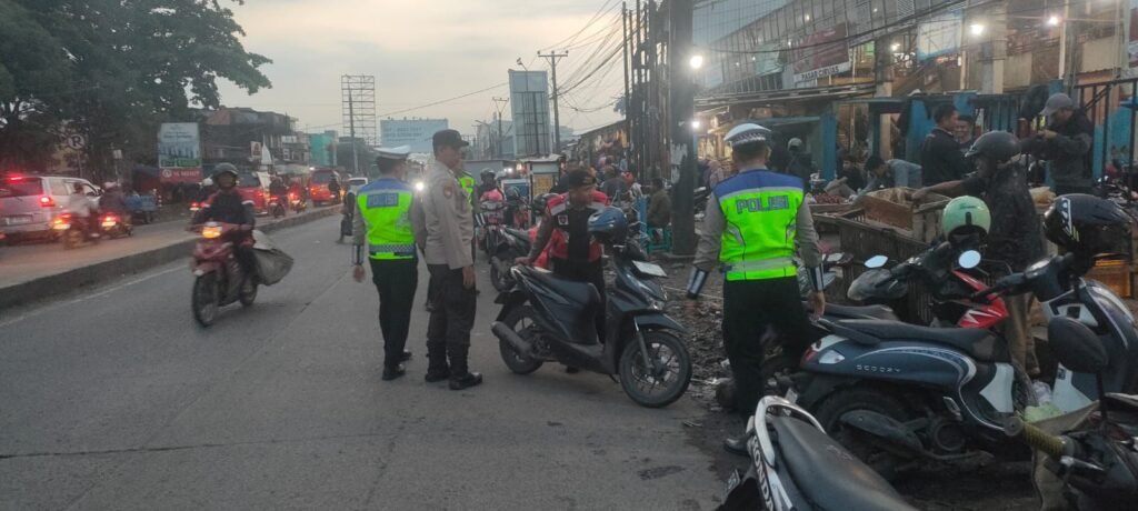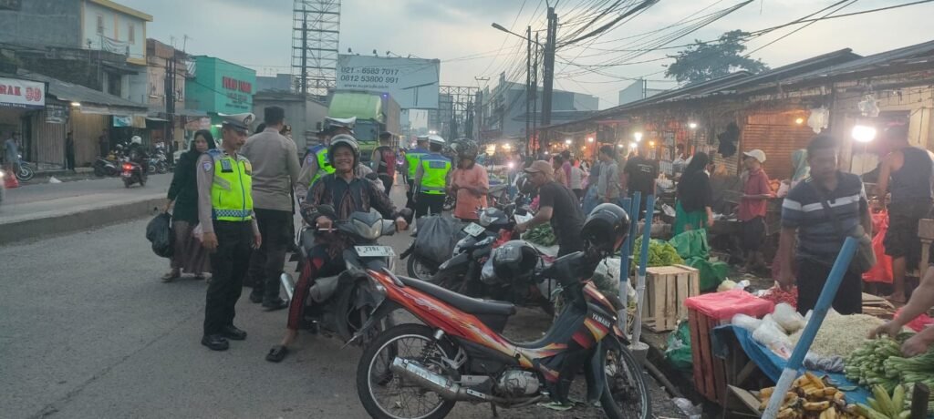 Petugas melaksanakan pengaturan arus lalu lintas, penertiban pedagang yang menggunakan badan jalan untuk berjualan, serta menindak kendaraan yang parkir sembarangan di bahu maupun badan jalan. Selain itu, personel juga memberikan imbauan secara humanis kepada pedagang dan pengunjung pasar agar mematuhi aturan demi keselamatan bersama.