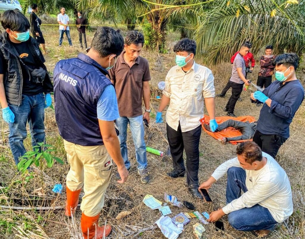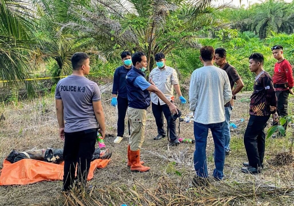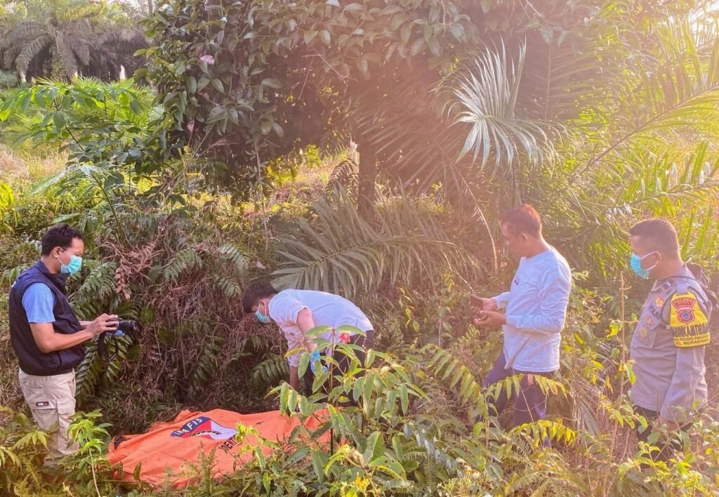 Jenazah ditemukan sekitar pukul 16.00 WIB. oleh warga, yang tengah Menyemprot, rumput di kebun sawit milik Rudi, di jalan palot, dusun Riding Panjang,