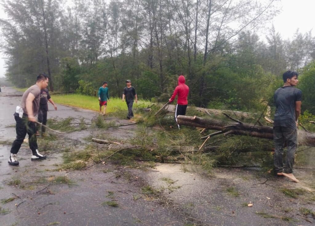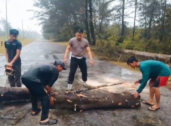 Global Rise TV (Bangka) -Merawang Hujan deras disertai angin, kencang Menyebabkan, sebuah pohon tumbang di ruas jalan lintas Timur, Kecamatan Merawang Kabupaten Bangka, yang sempat Mengganggu arus lalu lintas, Sabtu (25/04/2026),