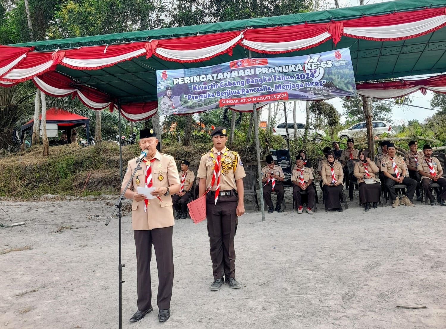 “Rozali, M.Pd Kepala Dinas Pendidikan Kab. Bangka mewali Ketua Kwartir Cabang Bangka, Membuka Secara Resmi Perkemahan Peringatan Hari Pramuka Ke-63, didampingi Wakil Ketua M.Nursi, M.Si, Waka Bidang Organisasi dzn Hukum Kwartir Cabang Bangka, selaku Pembina Upacara Mengharapkan kepada peserta upacara/peserta perkemahan adik-adik Pramuka bisa mengikuti kegiatan ini dengan baik, jaga kesehatan dan keamana, terutama peran pengurus, pembina, para panitia bisa bekerja dengan baik, dan Selamat memperingati hari Pramuka ke-63 Tahun 2024.