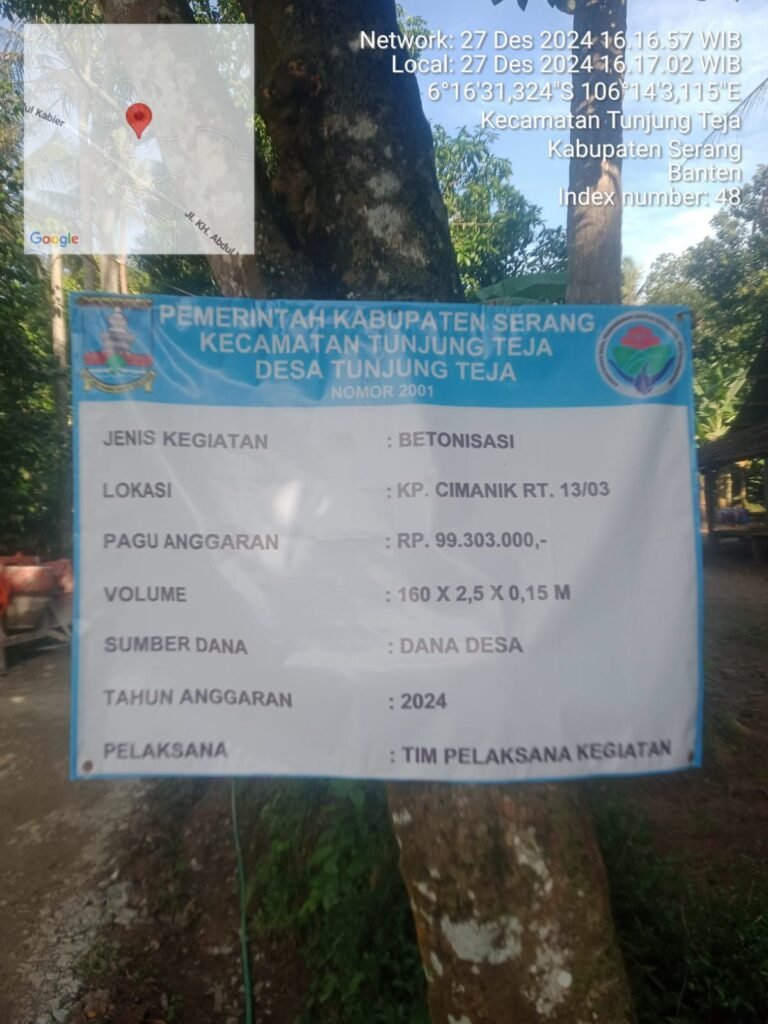 Pekerjaan proyek infrastruktur yang sedang dipekerjakan sudah berjalan beberapa hari yang lalu melalui anggaran dana desa ( DD) kini jadi menuai Sorotan publik, infrastuktur ,suatu persyaratan prioritas utama ,untuk masyarakat yang membutuhkan demi kelancaran mobilitas, khusus nya ,pengguna jalan kaki maupun pengguna jalan roda dua ,tepat nya di kampung , cimanik RT/RW 13/03 desa, Tunjung Teja kecamatan, Tunjung teja ,kabupaten serang,provinsi banten.