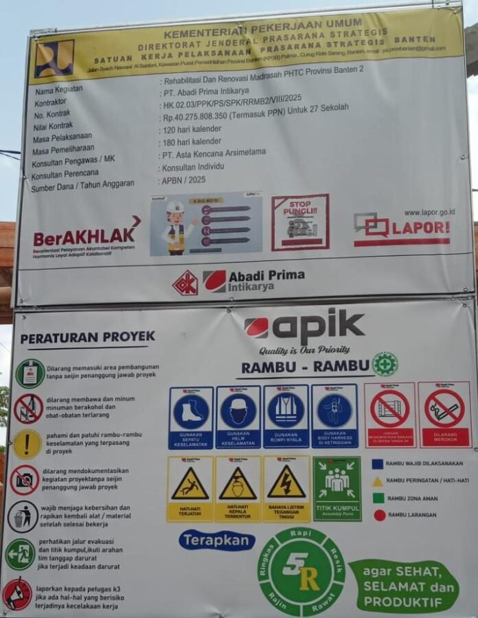 ‎DPP.JAM-Banten, Soroti dan Lakukan Investigasi Kelapangan Adanya Pelaksanaan Kegiatan Yang di Laksanakan Oleh Pihak Kementrian Pekerjaan Umum, Direktorat Jenderal Prasarana Strategis, Satuan Kerja Pelaksanaan Prasarana Strategis Banten. Nama Kegiatan : Rehabilitasi Dan Renovasi Madrasah PHTC Provinsi Banten, Kontraktor : PT. Abadi Prima Intikarya , No.Kontrak : HK.02.03/PPK/PS/SPK/RRMB2/VIII/2025, Nilai Kontrak : Rp. 40.275.808.350,- (Termasuk PPN) Untuk 27 Sekolah, Masa Pelaksanaan : 120 hari kalender , Masa Pemeliharaan : 180 hari kalender , Konsultan Pengawas/MK : PT. Asta Kencana Arsimetama , Konsultan Perencana : Konsultan Individu , Sumber Dana / Tahun Anggaran : APBN / 2025,Senin (22/9/2025).