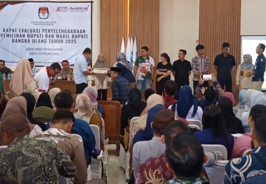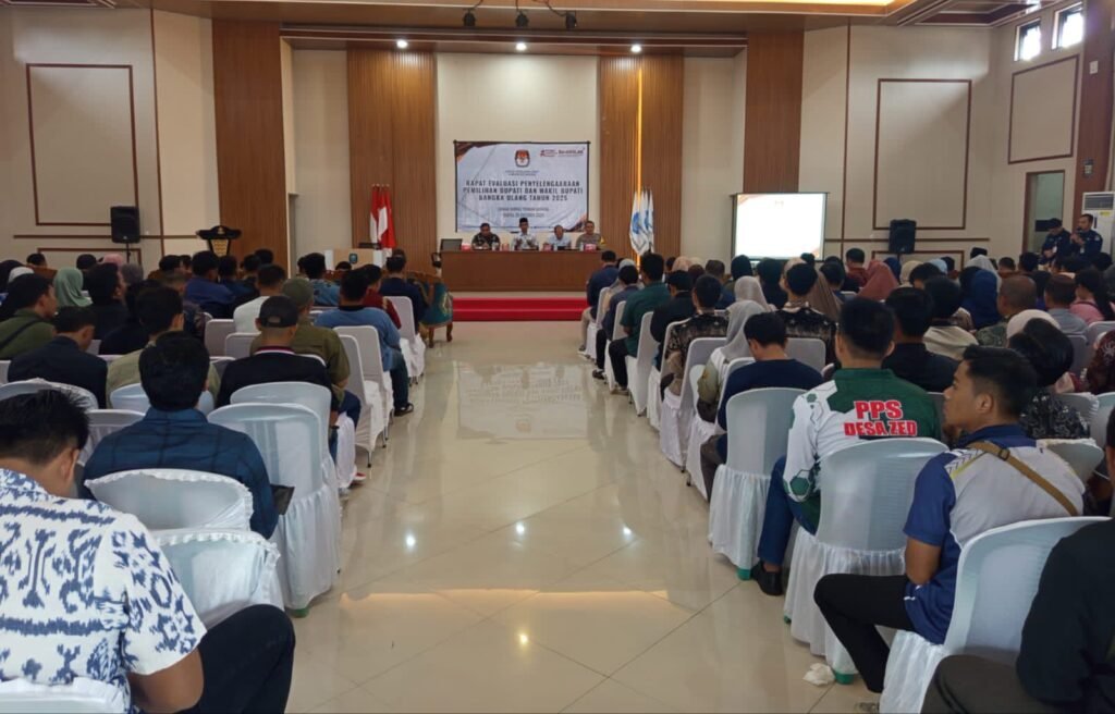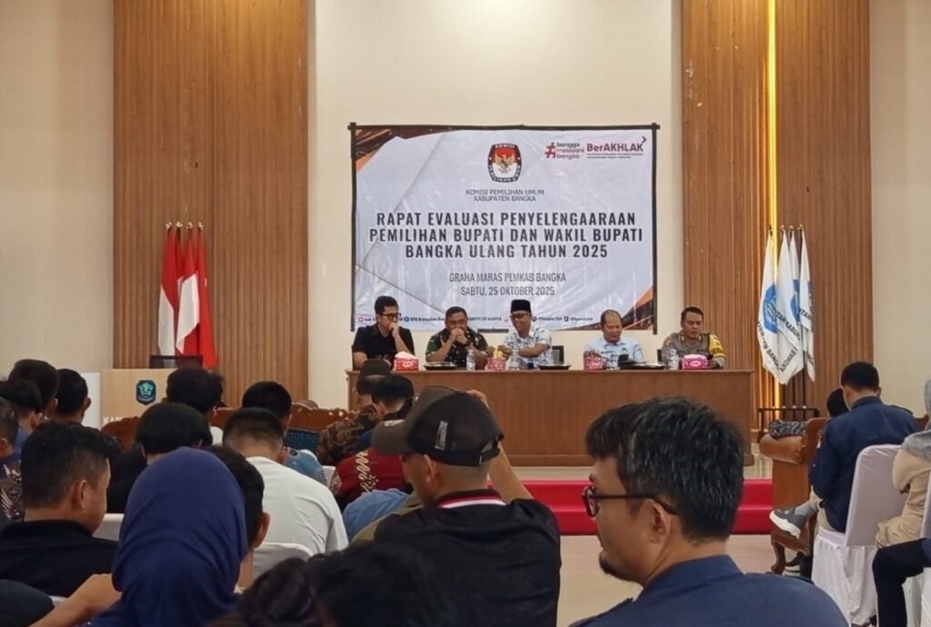 Kita berkumpul di Gedung Pertemuan Maras Pemda dalam rangka Evaluasi Penyelenggaraan Pemilihan ulang Bupati dan wakil bupati Bangka tahun 2025″, ucap Ketua KPU Bangka Sinarto,