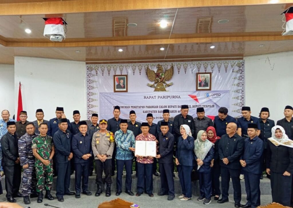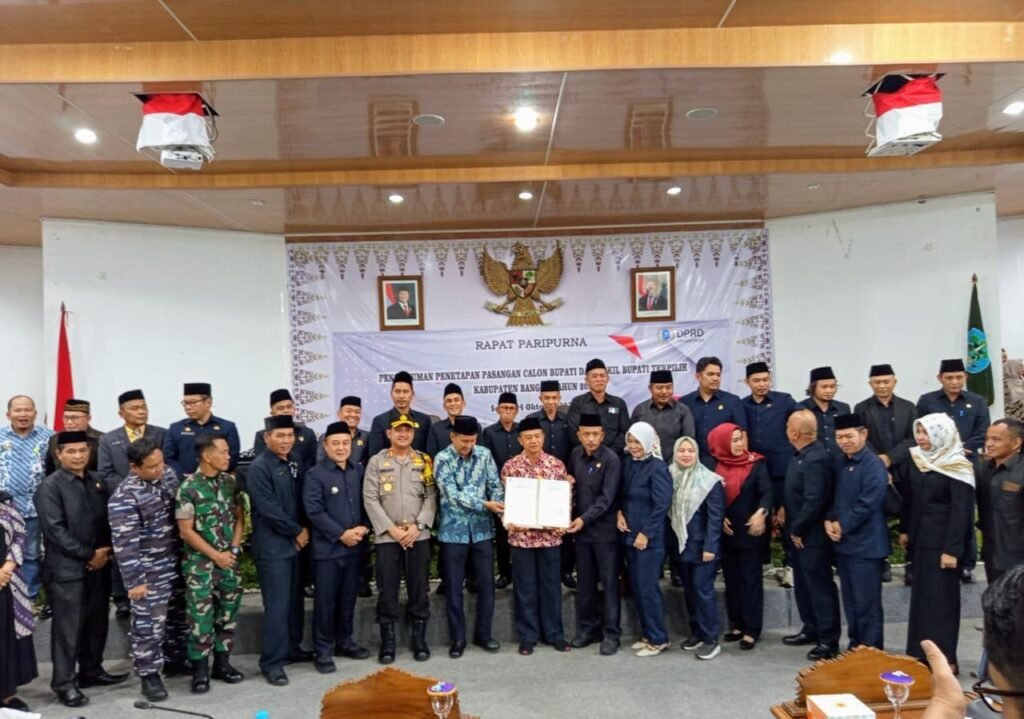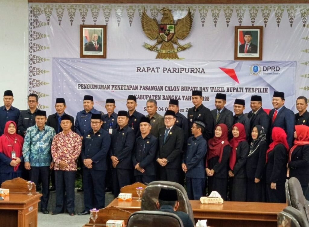 DPRD, Kabupaten Bangka, menggelar rapat Paripurna pengumuman, penetapan Pasangan Calon Bupati dan wakil terpilih 2025, Bertempat di Ruang Rapat Paripurna DPRD dan Bupati, Pasangan calon Bupati dan Wakil Bupati terpilih masa jabatan 2025-2030, adalah pasangan calon bupati Nomor urut (1) atas nama Fery Insani, SE, MM.,