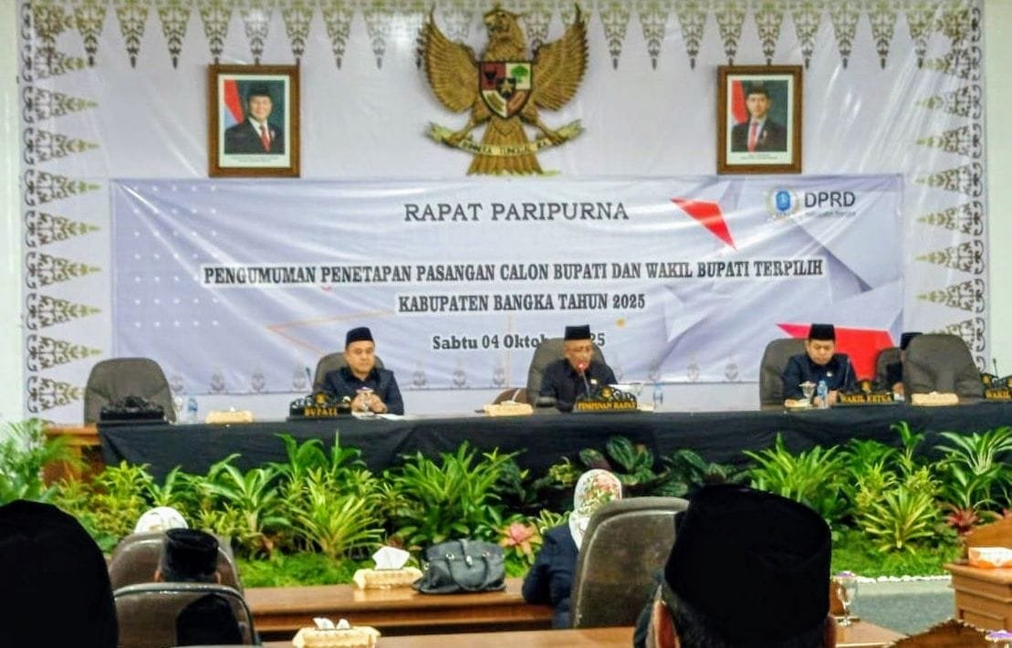 DPRD, Kabupaten Bangka, menggelar rapat Paripurna pengumuman, penetapan Pasangan Calon Bupati dan wakil terpilih 2025, Bertempat di Ruang Rapat Paripurna DPRD dan Bupati, Pasangan calon Bupati dan Wakil Bupati terpilih masa jabatan 2025-2030, adalah pasangan calon bupati Nomor urut (1) atas nama Fery Insani, SE, MM.,