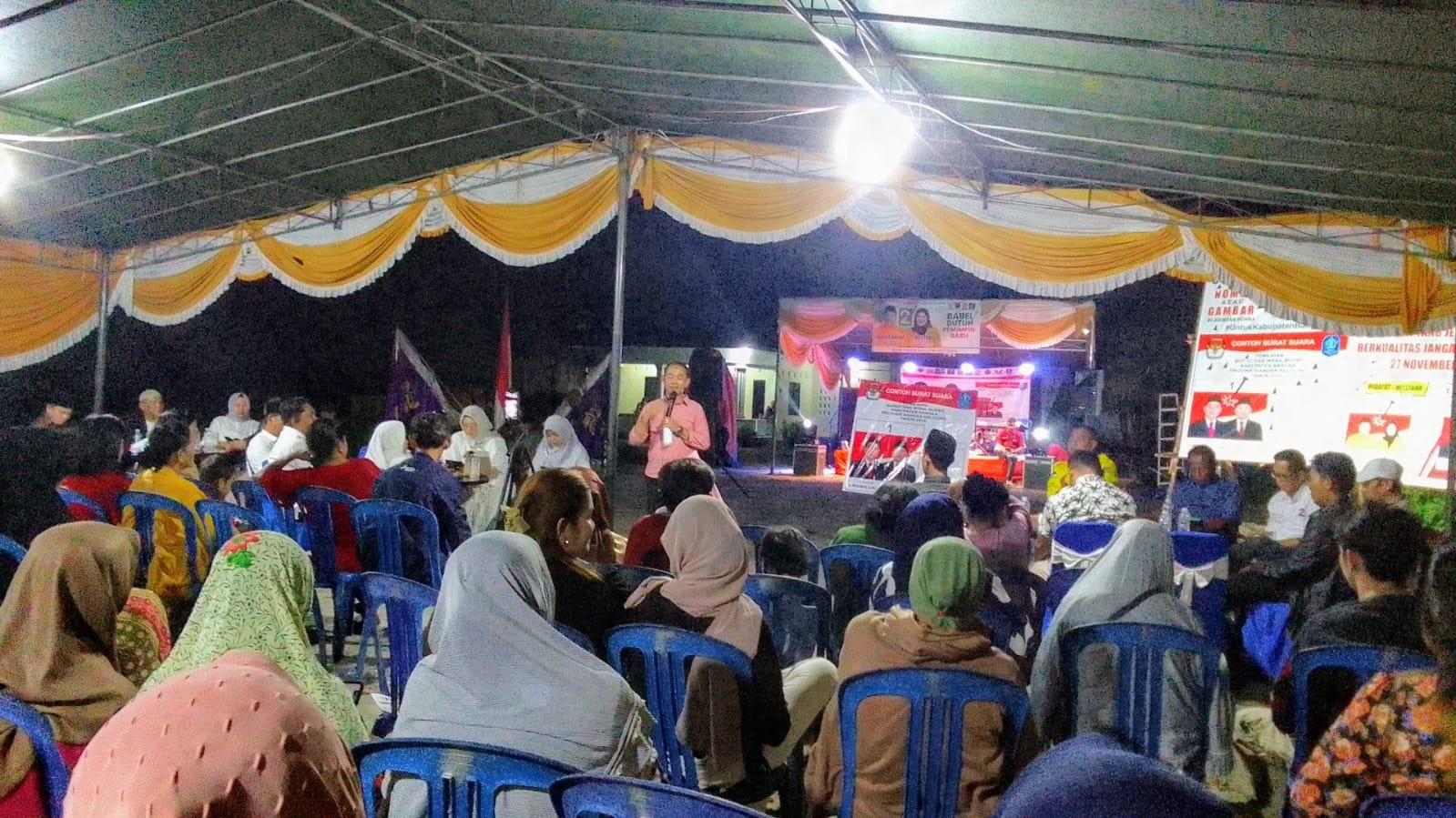 “Kami pada hari ini yang biasanya mungkin setelah melaksanakan Aktifitas malam hari, kita sudah Beristirahat, sehingga kita sudah Bercengkerama dengan keluarga, suami-istri anak dan cucu-cucu kita, tapi dengan kedatangan, kami hari ini Mungkin ada, ketergangguan rutinitas ibu bapak, maka kami atas nama pribadi dan keluarga besar dan Calon Bupati mohon, maaf atas tergangguan aktifitas ibu bapak,
