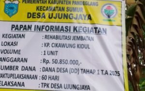Global Rise TV (Pandeglang, Banten) – Pemerintah Desa Ujungjaya, Kecamatan Sumur, Kabupaten Pandeglang, Provinsi Banten, melaksanakan kegiatan rehabilitasi jembatan yang berlokasi di Kampung Cikawung Kidul. Kegiatan ini merupakan bagian dari program pembangunan desa yang didanai melalui Dana Desa (DD) tahap 1 tahun anggaran 2025, dengan total anggaran sebesar Rp50.850.000, Kamis (17/4/2025).