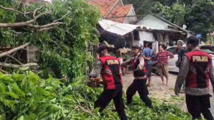 Menindaklanjuti laporan masyarakat, personel Sat Samapta Polres Purwakarta dengan sigap melakukan pengecekan TKP, pengamanan area, dan evakuasi pohon tumbang yang menutupi sebagian badan jalan provinsi.