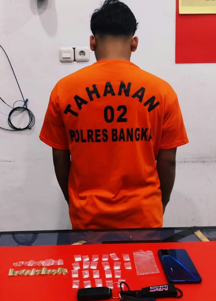 Global Rise TV (Bangka Belinyu) Satuan Reserse Narkoba Polres Bangka, kembali berhasil Mengungkap kasus, tindak pidana penyalahgunaan, Narkotika di wilayah hukum Polres Bangka, Se orang, pemuda berinisial F (21) di Amankan, petugas bersama sejumlah Barang, bukti yang diduga Narkotika jenis sabu,