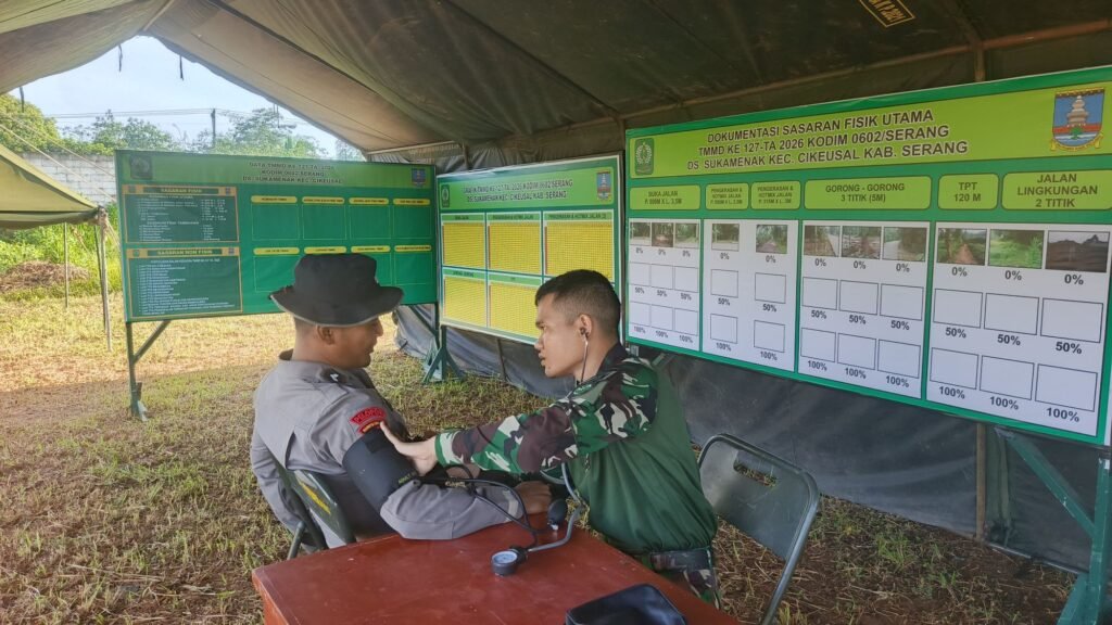 Di sebuah tenda sederhana yang berdiri di lokasi kegiatan, tampak Serma Mahdi, Bintara Kesehatan dari Denkesyah 03.04.04 Serang, dengan penuh ketelitian memeriksa kondisi kesehatan salah satu anggota Satgas. Satu per satu prajurit diperiksa tekanan darah dan kondisi fisiknya, memastikan mereka tetap prima dalam menjalankan tugas mulia membangun desa.