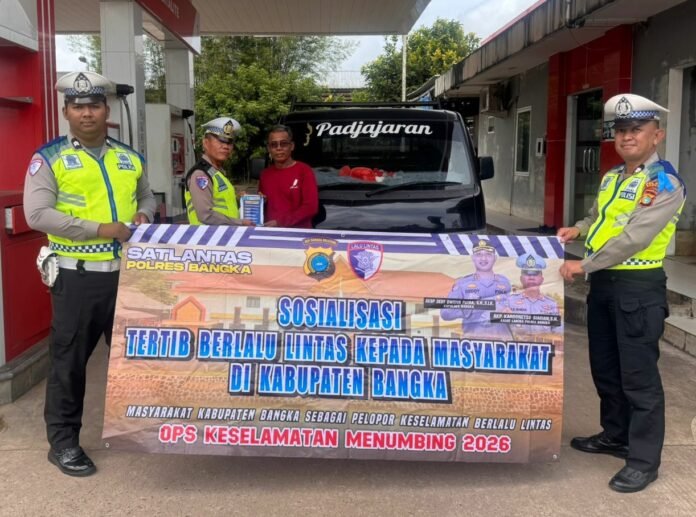 Global Rise TV (Bangka)-Dalam rangka mendukung pelaksanaan, operasi keselamatan, Menumbing tahun 2026, personel satuan lalu lintas, (Satlantas) Polres Bangka, melaksanakan kegiatan Himbauan, dan peneguran kepada pengguna, jalan, disertai pembagian Brosur, serta penempelan stiker keselamatan lalu lintas, kegiatan tersebut dilaksanakan di, wilayah hukum Polres Bangka. Minggu (08/02/2026),