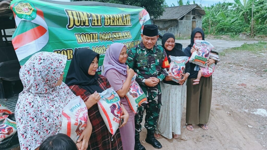 Global Rise TV (Cipocok Jaya, Kota Serang)-Dalam rangka meningkatkan kepedulian sosial terhadap masyarakat yang membutuhkan, Sertu Susilo, Babinsa Koramil 0602-05/Cipocok Jaya, membagikan beras gratis sebanyak 200 sak (@5 Kg) kepada masyarakat lansia dan anak yatim di lingkungan Parung Rt. 03 Rw. 04, Kelurahan Panancangan, serta Rt. 03 Rw. 01, Lingkungan Babakan, Kelurahan Gelam, Kecamatan Cipocok Jaya, Kota Serang, Provinsi Banten. Kegiatan ini dilaksanakan pada Jum’at (21/02/2025) dalam program “Jum’at Berkah”.