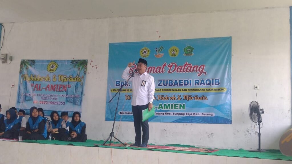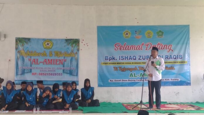 Staf Khusus Menteri Sosial Republik Indonesia (RI) meninjau langsung kegiatan kelompok Hadroh dan Marawis Al-Amien di Yayasan Nurul Falah Gosali, Desa Bojong Catang, Kecamatan Tunjung Teja, Kabupaten Serang, pada Rabu (8/10/2025).