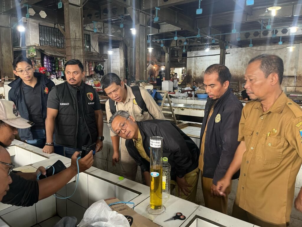 Global Rise TV (SERANG)-Satgas Pangan Polres Serang dan Diskopumindag Kabupaten Serang mengambil sample minyak goreng bermerek MinyaKita kemasan 1 liter kemasan pouch dan botol plastik di Pasar Ciruas, Kabupaten Serang, Selasa (11/3).