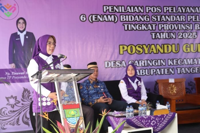 Global Rise TV (Tangerang-Banten)–Ketua Tim Pembina (TP) Posyandu Provinsi Banten Tinawati Andra Soni memperkenalkan seragam resmi Posyandu dalam kunjungannya ke Posyandu Gurame, Desa Caringin, Kecamatan Cisoka, Kabupaten Tangerang, Senin (10/11/2025). Seragam berwarna ungu dengan padanan celana hitam serta tulisan Posyandu 6 SPM ini menjadi simbol baru kebanggaan bagi kader Posyandu di seluruh Indonesia.