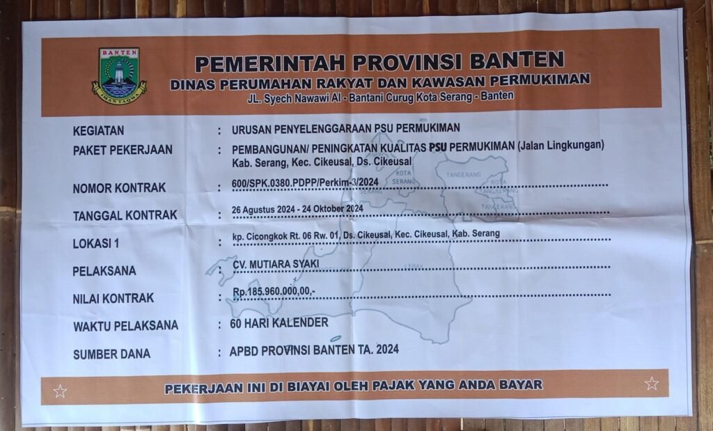 CV Mutiara Syaki Sebagai pemenang tender pada kegiatan tersebut dengan nomor kontrak : 600/SPK.0380.PDPP/PERKIM-3/2024. dengan nilai kontrak Rp 185.960.000.00,. ( Seratus delapan puluh lima juta sembilan ratus enam puluh ribu rupiah) yang bersumber dari APBD Provinsi Banten melalui Aspirasi Dewan Tahun Anggaran 2024 atau lebih jelasnya lagi dari hasil pajak yang telah kita bayar pertahunnya. ( Sumber Data PIP)