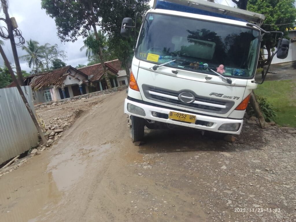 Glibal Rise TV (Pandeglang) – Sebuah truk pengangkut pakan ayam dengan nomor polisi B 9252 UM amblas di Kampung Cimoyan, Desa Ciherang, Kecamatan Picung, Kabupaten Pandeglang, pada hari Minggu (….) dini hari. Peristiwa terjadi sekitar pukul 03.00 WIB saat truk bermuatan sekitar 16 ton pakan ayam milik Popan Ciherang melintas di jalan kampung tersebut.