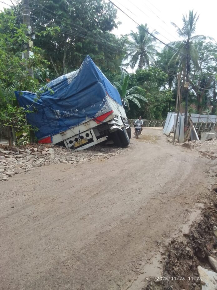 Glibal Rise TV (Pandeglang) – Sebuah truk pengangkut pakan ayam dengan nomor polisi B 9252 UM amblas di Kampung Cimoyan, Desa Ciherang, Kecamatan Picung, Kabupaten Pandeglang, pada hari Minggu (….) dini hari. Peristiwa terjadi sekitar pukul 03.00 WIB saat truk bermuatan sekitar 16 ton pakan ayam milik Popan Ciherang melintas di jalan kampung tersebut.