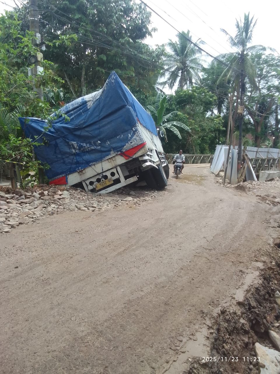 “Awalnya terdengar suara keras. Ternyata truknya sudah amblas ke pinggir jalan,” ujar salah satu warga Cimoyan.
