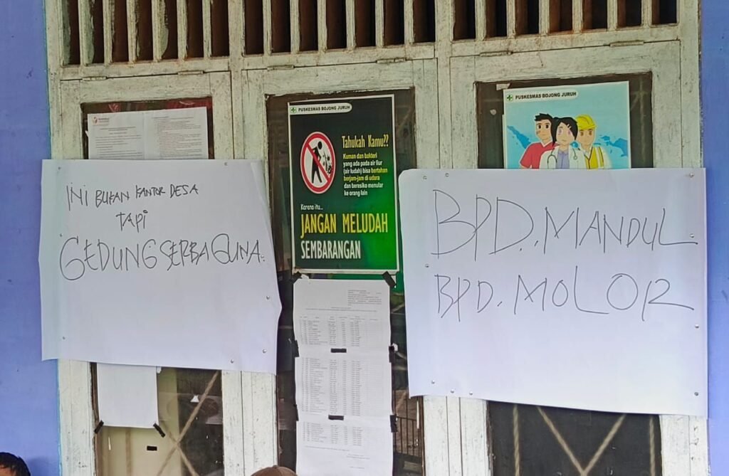 Global Rise TV (Lebak)-Bentuk kekecewaan masyarakat tidak hanya ditujukan kepada Kepala Desa, tetapi juga kepada Badan Permusyawaratan Desa (BPD) yang dianggap mandul dan lamban menangani keresahan warga. Protes dari warga semakin memanas, sehingga mereka mendatangi kantor desa dengan melakukan orasi dan menempelkan spanduk protes kepada BPD, Senin (20/01/2025).