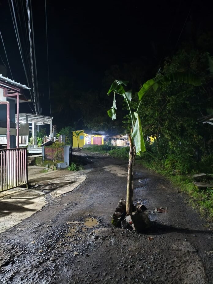 Sebelumnya kami sudah berulang kali mengeluhkan kondisi jalan ini tapi sampai sekarang belum ada tindakan nyata,karena rasa prustasi kami ahirnya memutuskan untuk melakukan aksi dengan menanam pohon pisang dijalan yang berlubang ini.