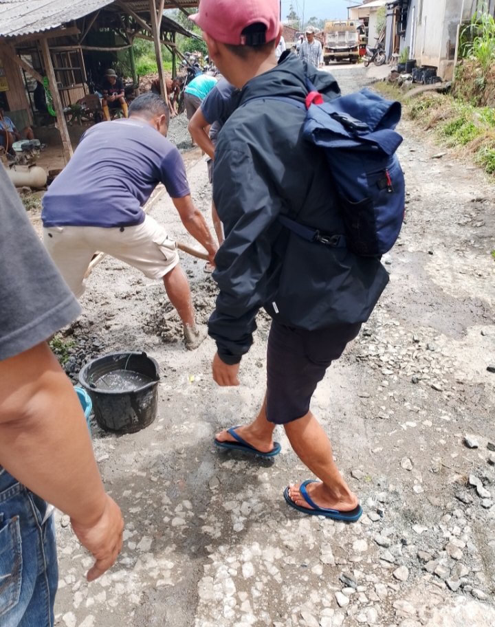 Salah satu bandar sayuran saat di konfirmasi mengatakan, “Ya, kami bergotong-royong dengan menambal jalan rusak berlubang di sekitar Kampung Ciparigi dan Bayongbong. Ini istilahnya masyarakat urunan, ada yang bawa semen, ada yang bawa material pasir dan lainnya. Kalau tidak bisa bantu tenaga, warga biasanya menyumbang dengan membawa aneka makanan-minuman,” Ucapnya.