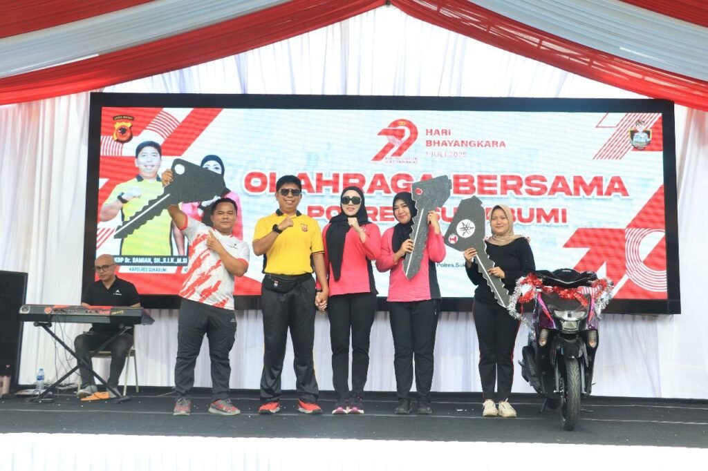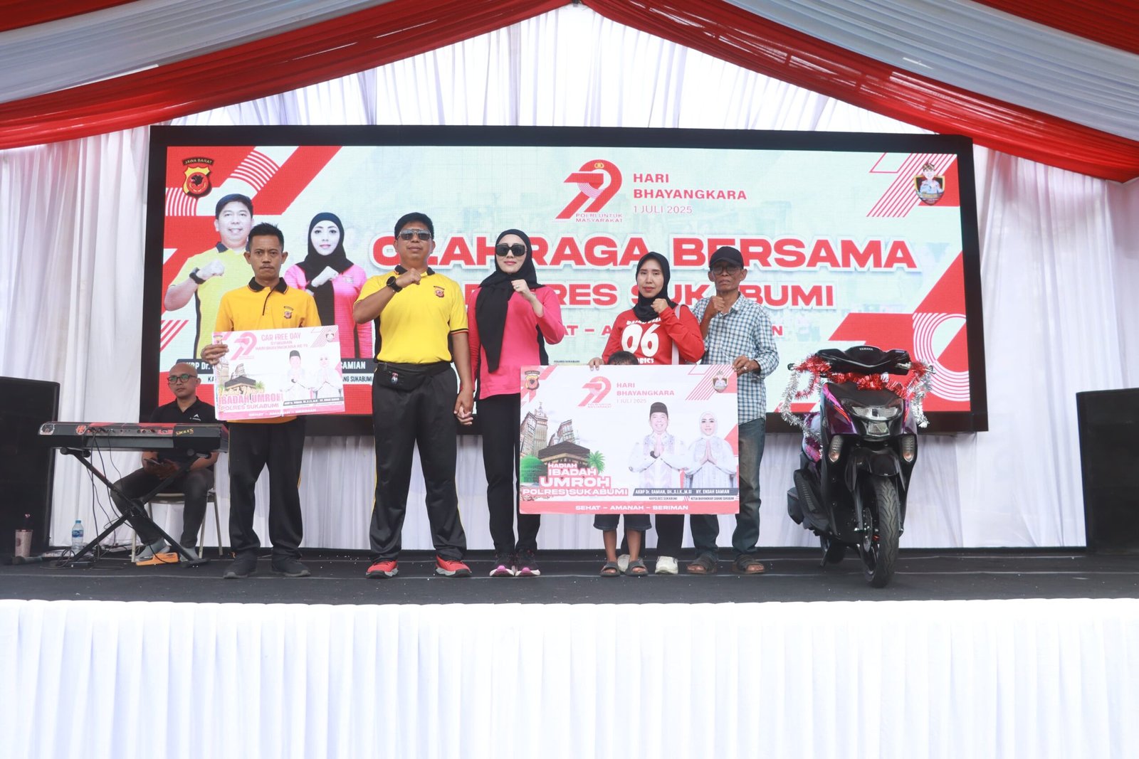Rangkaian acara olahraga bersama meliputi apel, jalan santai, pengambilan kupon, senam sehat, hiburan organ tunggal sambil menikmati hidangan, hingga pembagian hadiah dan doorprize utama, termasuk hadiah umrah dan dua unit sepeda motor. Selain itu, turut digelar lomba menghias nasi tumpeng yang diikuti oleh ibu-ibu Bhayangkari Polres Sukabumi.