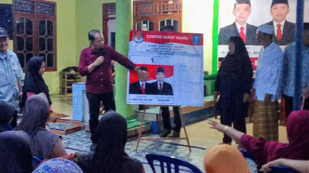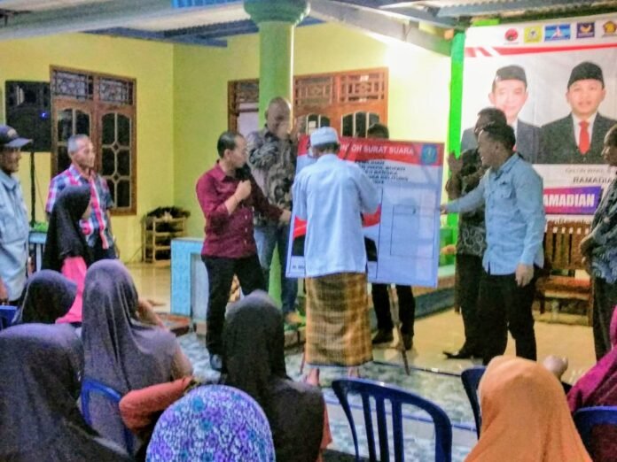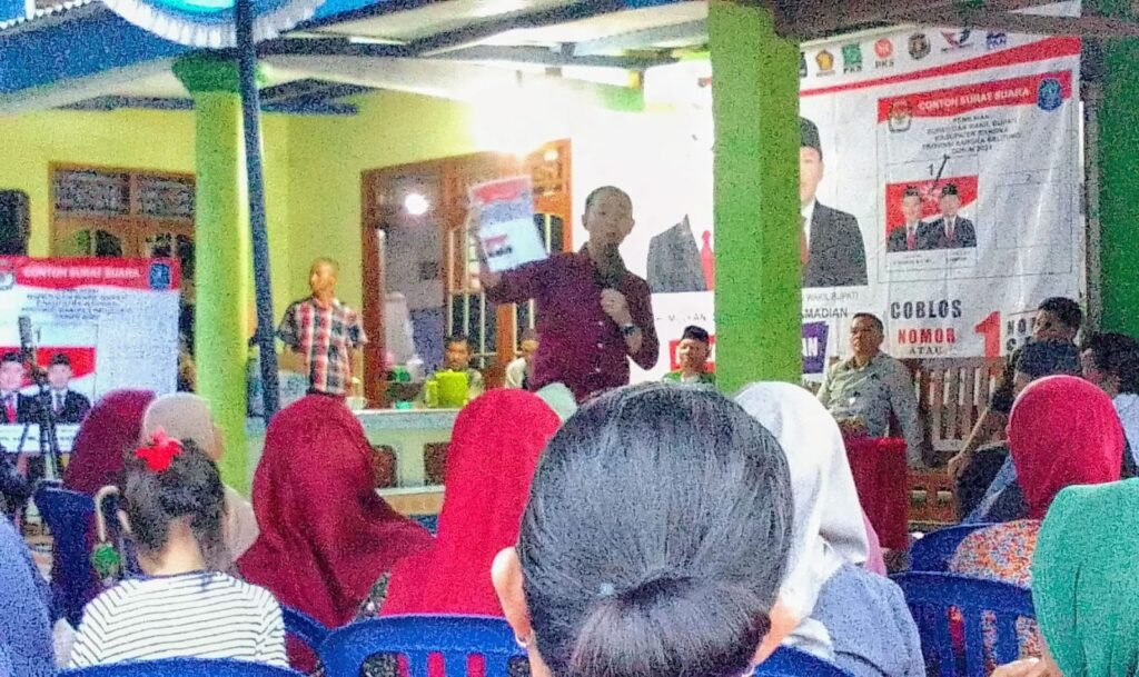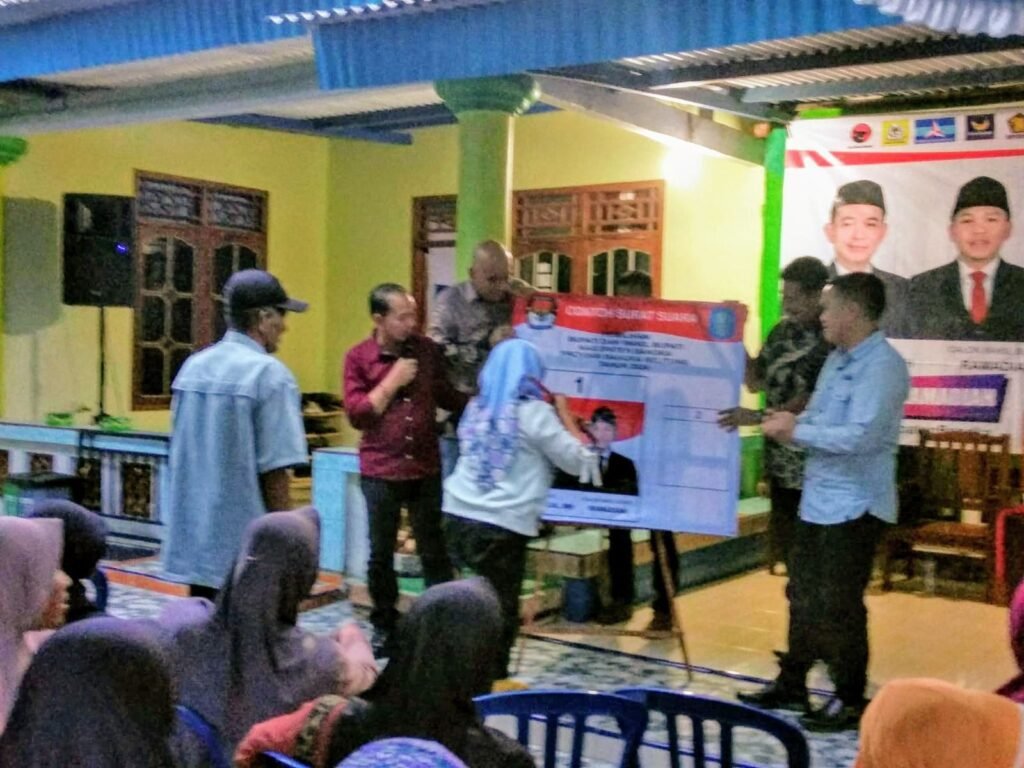 “(27) November kita mendapat (2) kertas suara, pertama warna merah marun untuk Gubernur untuk Gubernur ada (2) yang pertama Bapak Erzaldi, Rosman Djohan, yang kedua Bapak Hidayat Arsani, sedangkan yang Kabupaten warna list biru dan kami adalah Calon tunggal, sehingga kami sampaikan kepada ibu bapak, walaupun calon tunggal kami belum menang kalau masyarakat tidak datang ke, (TPS) memilih Pak Mulkan, dan Ramadian,