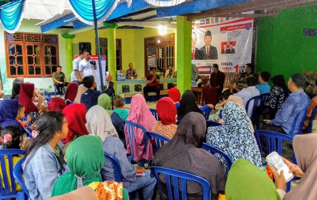 “Ratusan masyarakat lingkungan Bedeng Ake, kelurahan Sinar, Jaya Jelutung kabupaten Bangka, menghadiri kampanye dialogis, pasangan, Calon Bupati dan Wakil Bupati Bangka Mulkan, Ramadian,